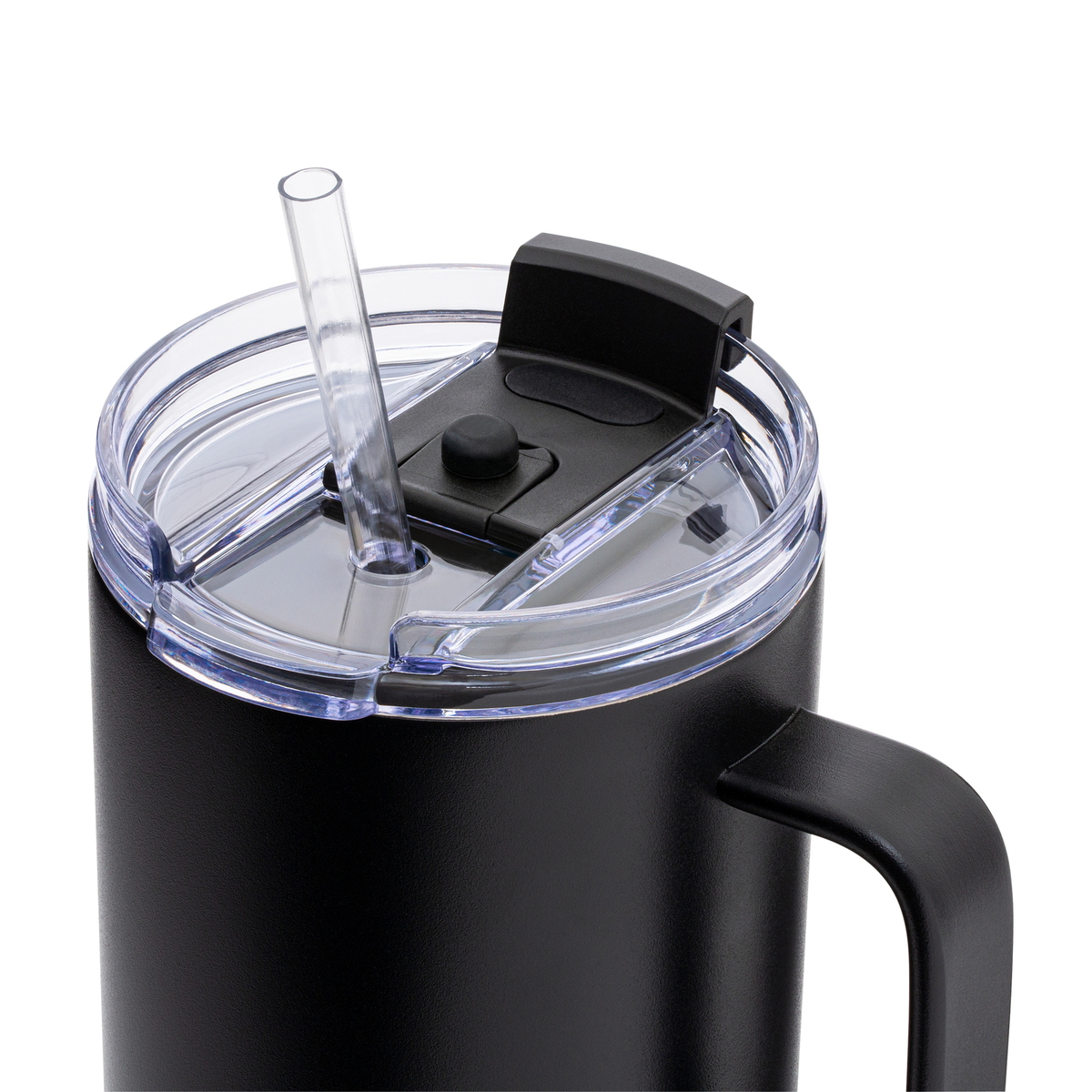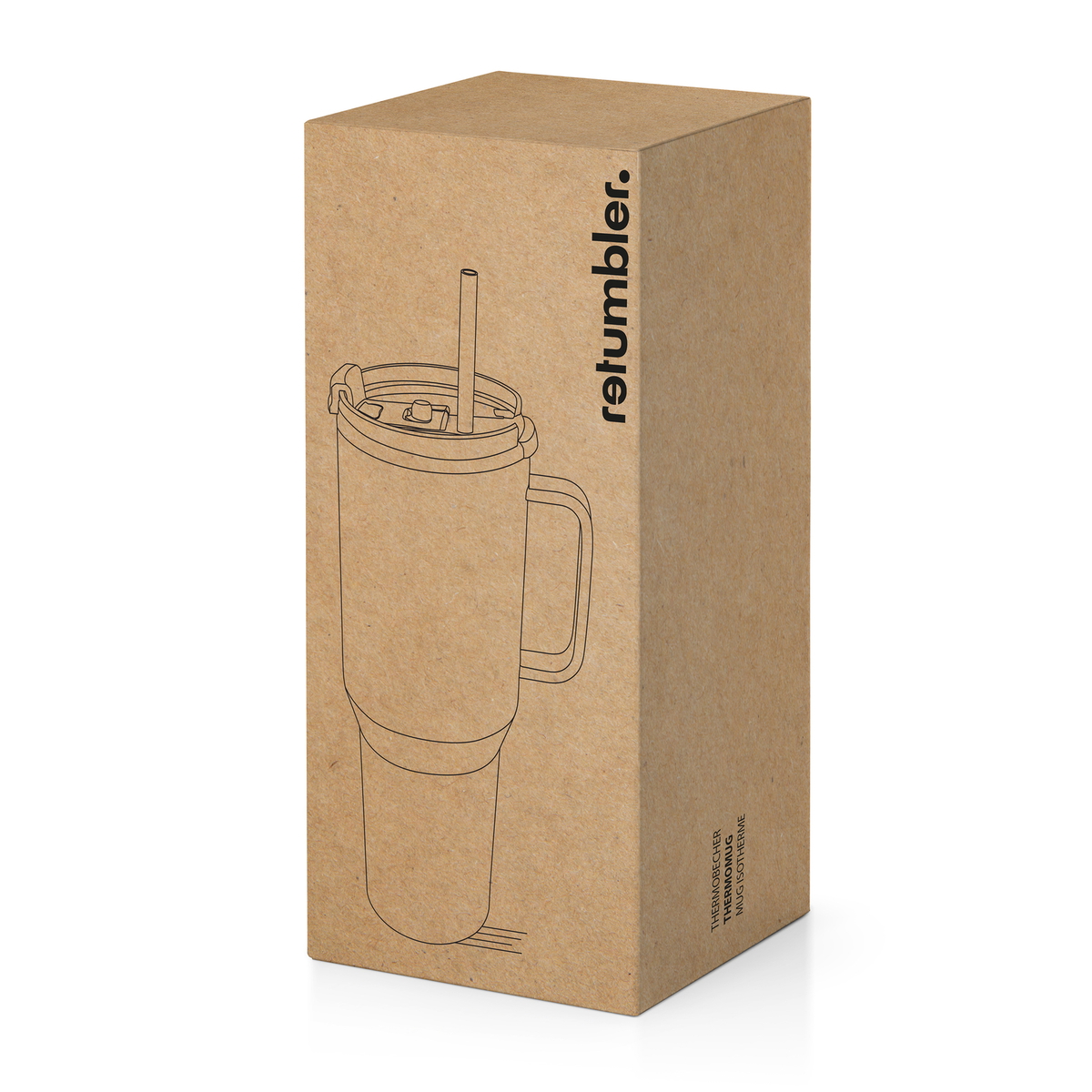 Discover the RETUMBLER-Grand Canyon thermo mug! With an impressive capacity of 1200 ml, it is the ideal companion for long periods of thirst. The powder-coated thermo mug is made from recycled stainless steel, AS and PP plastics. Thanks to the double-walled copper vacuum insulation, the drink stays cold for up to 32 hours or hot for up to 9 hours. The mug is particularly suitable for summer refreshments. Prefer it ice-cold? Thanks to the generous opening, ice cubes can be easily added, which stay frozen for up to 48 hours due to the excellent insulation of the mug.The leak-proof, multifunctional plug lid has both a closable straw opening and a flip-lid opening. This allows you to conveniently use the mug not only at home or in the office, but also on the go. Tip: The included Tritan straw has a useful stopper at the bottom to prevent slipping out. This way, the straw stays securely in place even with carbonated drinks.
