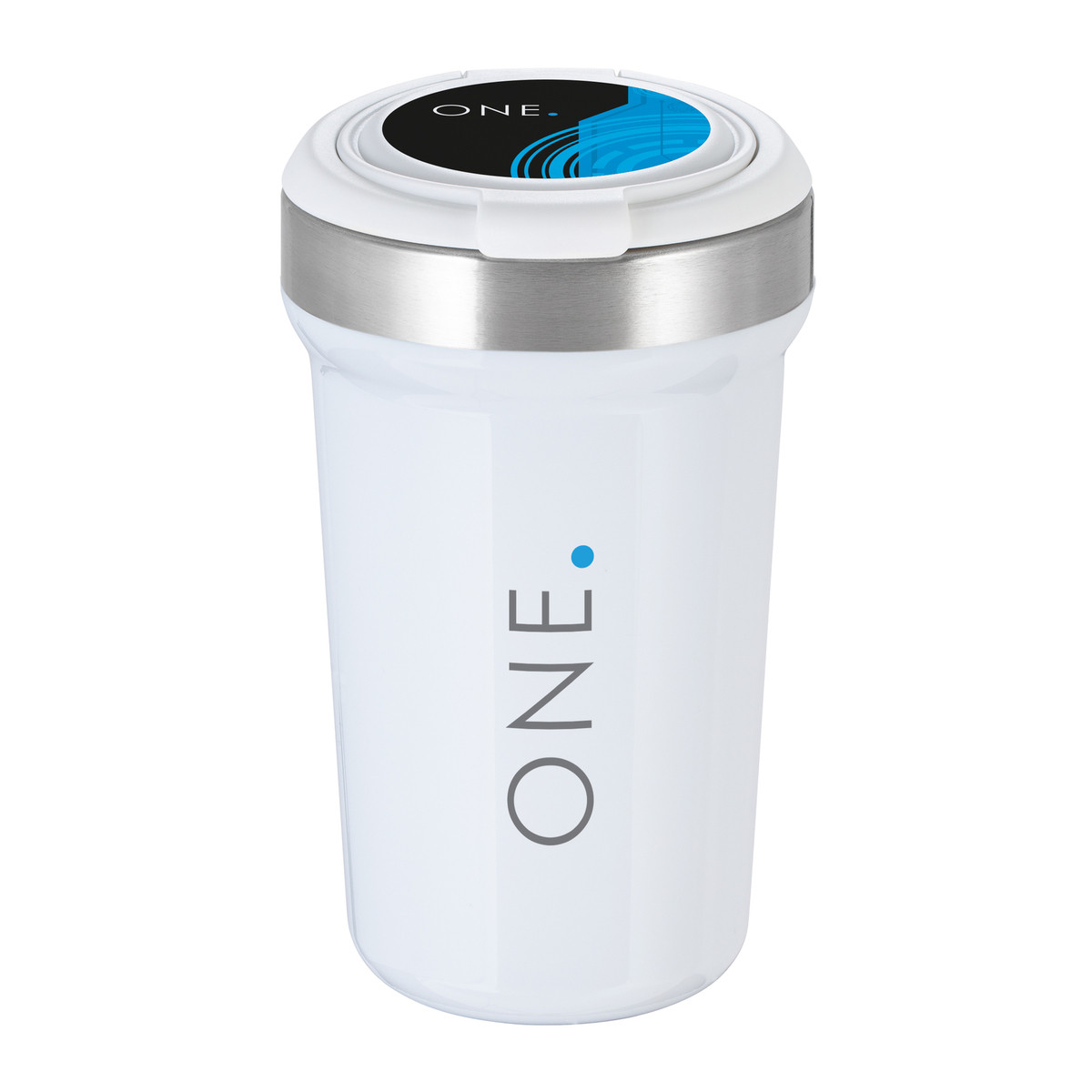 Our playful own development of the 350 ml mug consists of three components: The inner mug is made of high-class stainless steel, which can be matched with a white or black lid featuring a printing area that is unique on the market. In order to round off the concept, there is a choice of twelve outer mug colours - ten transparent and two opaque mug colours.