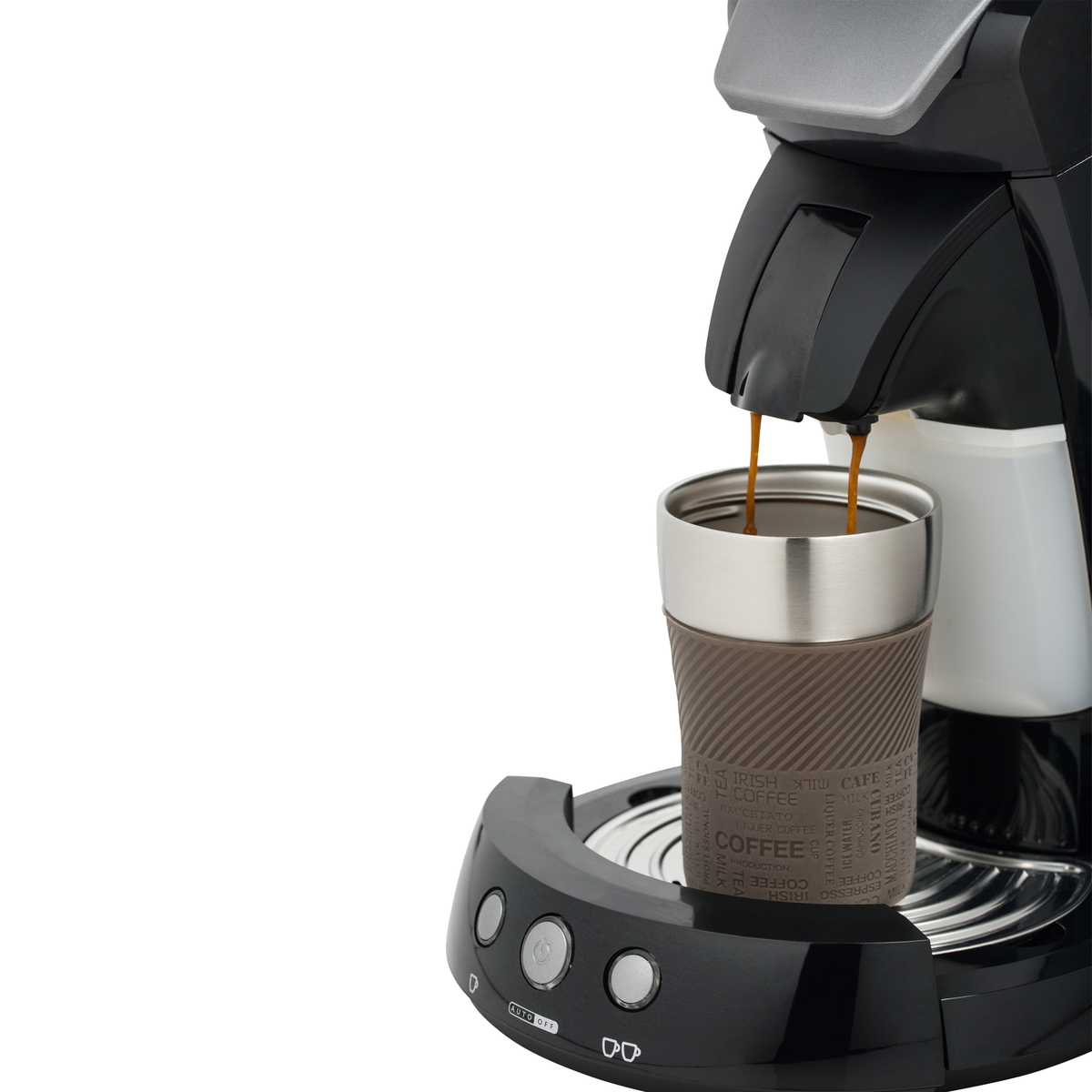 Thanks to a low height the double-walled mug with silicone sleeve fits underneath many common coffee pad and capsule machines. 230 ml.