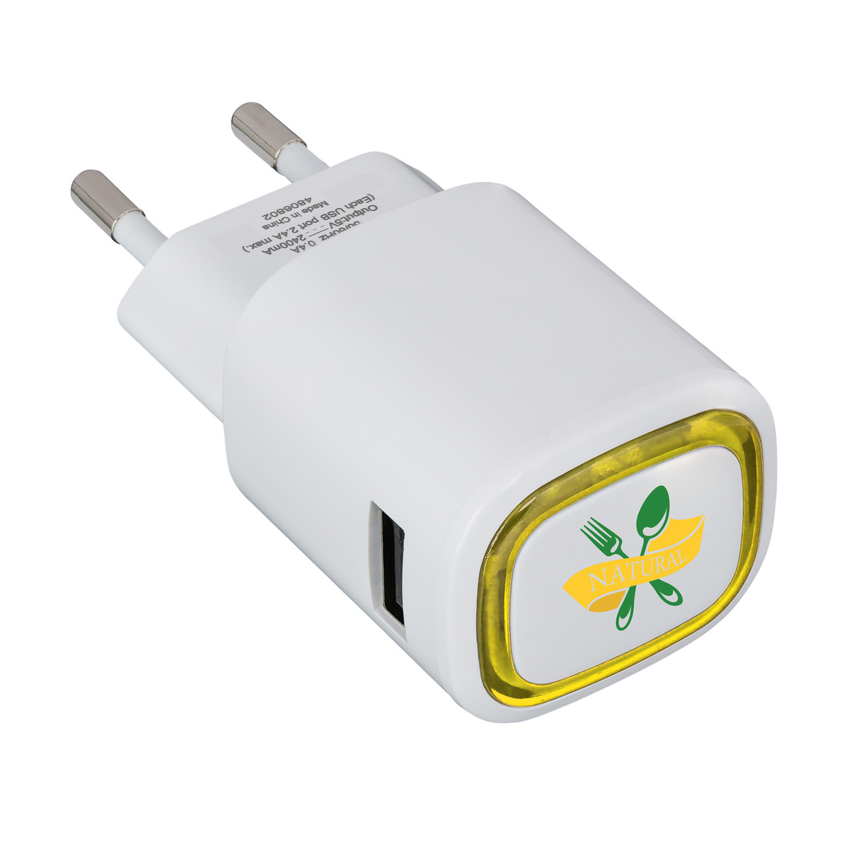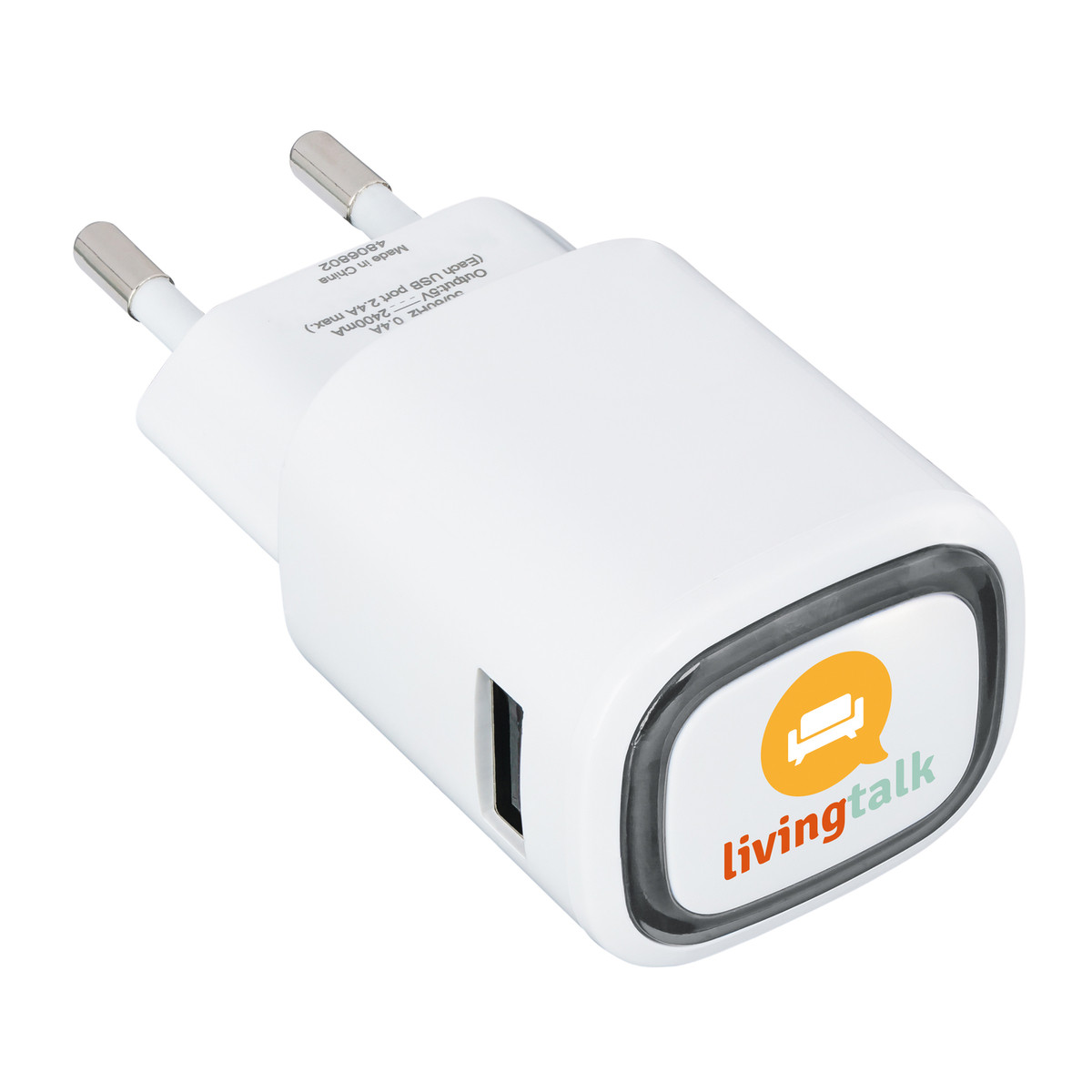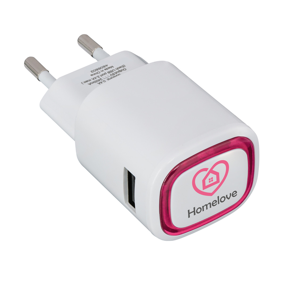 The plug for charging your devices using a wall socket has an input of 100 to 240 V, 50/60 Hz and an output of up to 2 x 5 V / 2.4 A. The plug is TUV GS certified. The colour ring around the logo plate is illuminated by LED backlight.