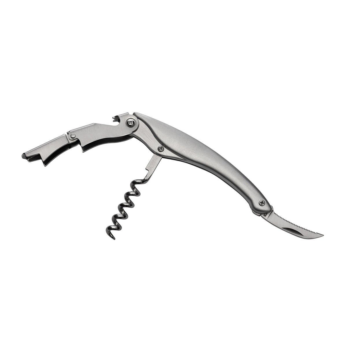 The RE98-Silverserve waiter's knife is exceptionally practical and comfortable to use. Crafted from aluminium, this wine bottle opener sits perfectly in the hand and is pleasantly light weight. It offers three tools: a corkscrew, a bottle opener, and a foil cutter with a sturdy saw edge.A standout feature of this product is its double lift mechanism. Due to this design, even long and delicate corks can be removed with ease. All tools fold away securely for compact storage.