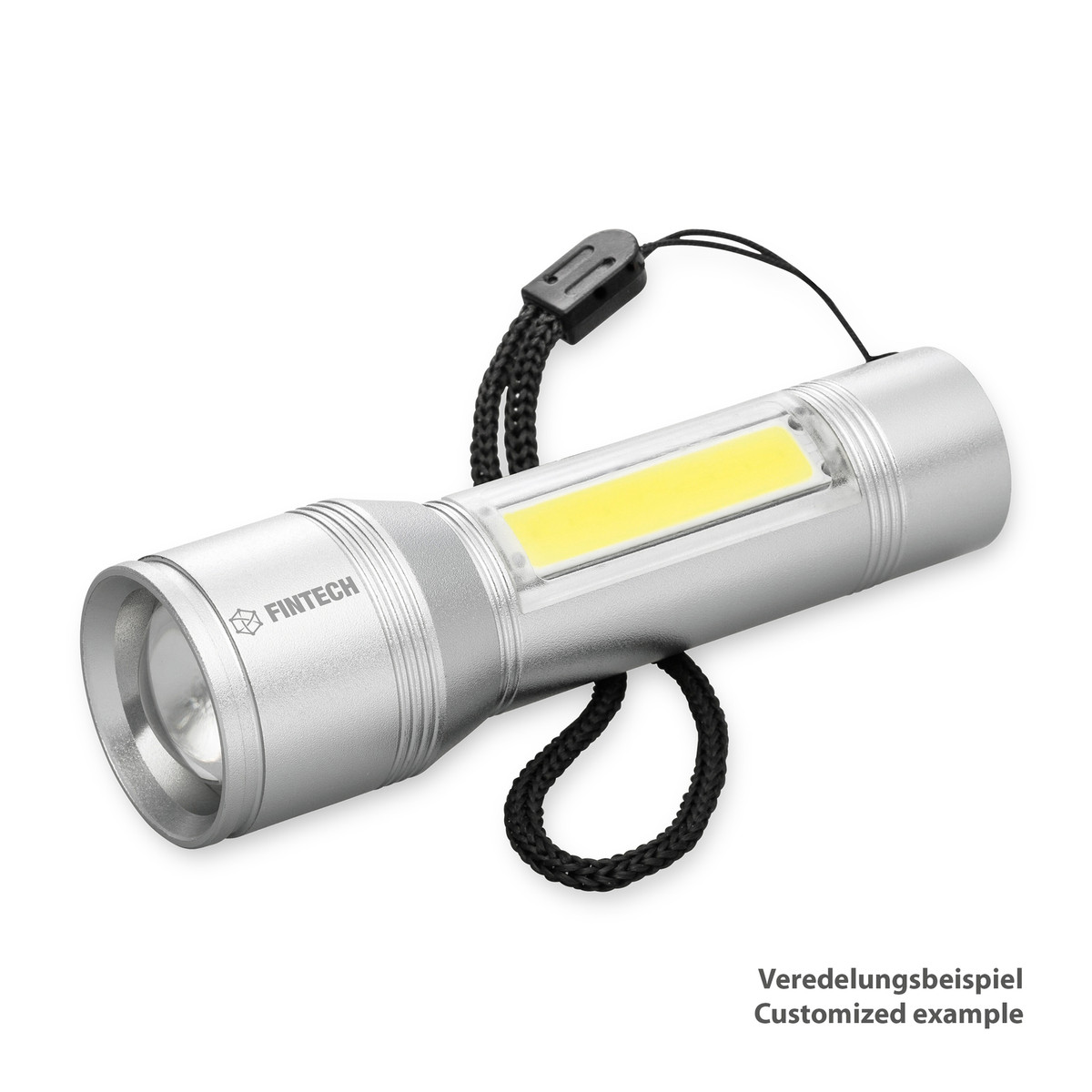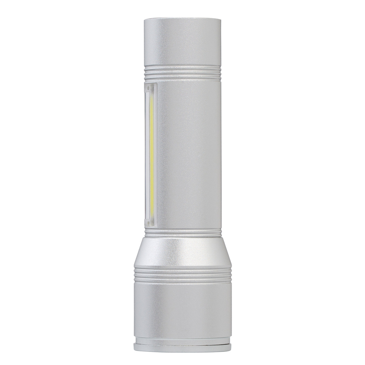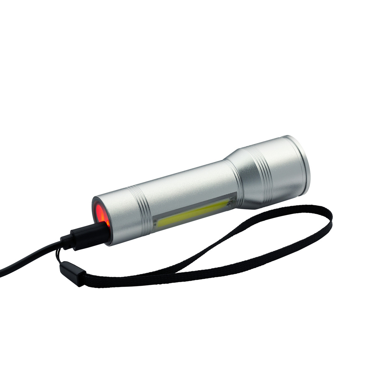 Cette lampe de poche rechargeable en aluminium est disponible en argenté ou noir anodisé. Elle possède un éclairage LED avec zoom du faisceau lumineux et un éclairage COB sur le côté. Une bande de préhension noire se trouve à hauteur de la tête de la lampe de poche.La lampe LED de 96 lumens a une autonomie de 45 minutes (luminosité maximale = 7 200 candelas). La lampe COB de 100 lumens affiche une autonomie d’une heure (luminosité maximale = 60 candelas). Cette lampe de poche dispose de trois modes d’éclairage : un éclairage LED devant, une lampe torche et un éclairage COB sur le côté.