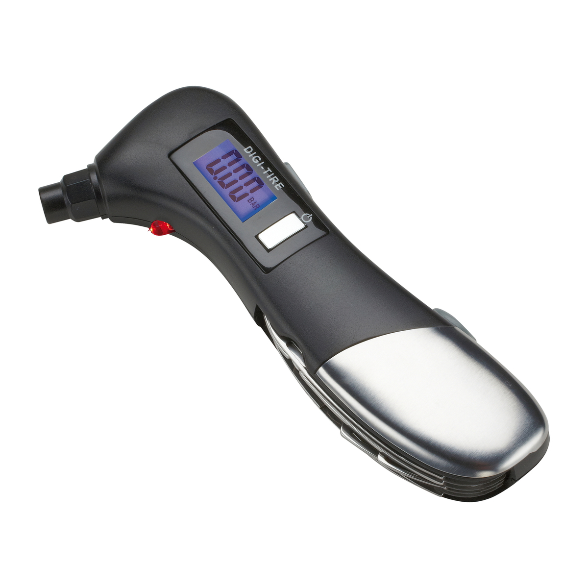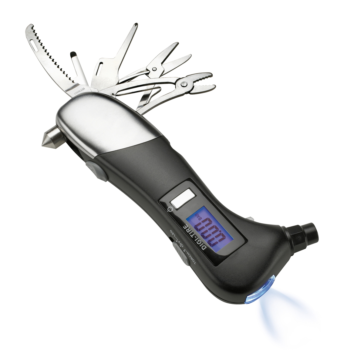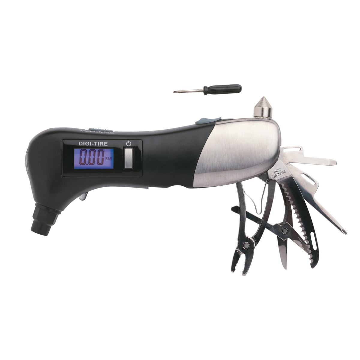 Ce manomètre pour pneus dispose d'une lampe de poche LED, d'un marteau et d'une lampe d'urgence.