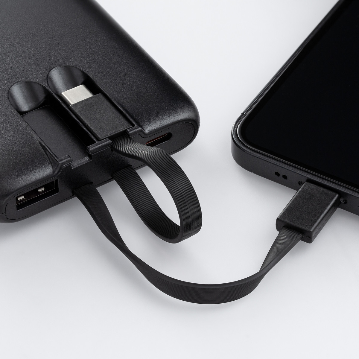 Le Powerbank REEVES-Pulsexpress 5 est efficace, compact et fiable. D'une capacité de 5000 mAh, il assure une charge fiable de vos appareils à tout moment. L'écran indique en permanence le pourcentage précis de la batterie, tandis que l'interrupteur latéral permet une utilisation sans effort. Qu'il s'agisse d'une connexion USB-C ou 8-Pin pour Apple®, le câble intégré vous couvre pour tous les appareils mobiles grand public. Bénéficiez d'une puissance de sortie rapide de 10 watts et d'un arrêt automatique intelligent après 40 secondes d'inactivité pour économiser l'énergie. Le tout dans un design noir élégant en plastique ABS recyclé. Le REEVES-Pulsexpress 5 - la quintessence du powerbank pour la vie professionnelle contemporaine.Le marquage est appliqué sur la zone la plus visible du powerbank par tampographie ou impression UV.