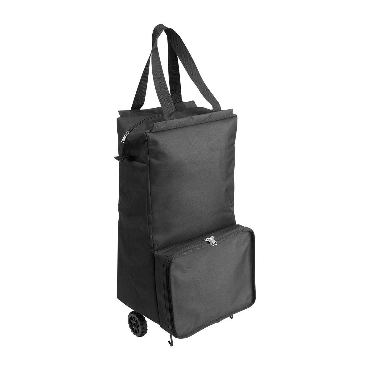 Trolley pliable avec poche sur le devant et compartiment isotherme. On peut le tirer ou le porter.