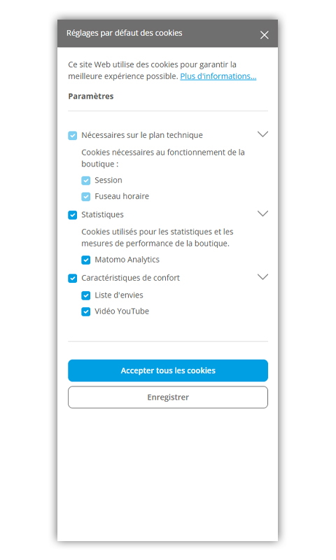 Chez nous aussi, on vous demande au début de votre visite sur le site quels cookies vous souhaitez accepter. Les cookies sont des données que les sites Web peuvent stocker sur l’appareil du visiteur. Il peut s’agir, par exemple, d’informations sur le choix de la langue, le fuseau horaire du visiteur ou des informations de session pour le fonctionnement du panier d’achat. En règle générale, la RGPD impose de demander le consentement des utilisateurs avant d’enregistrer un cookie. Les cookies utilisés doivent également être publiés. Les cookies nécessaires d’un point de vue technique ne nécessitent pas de consentement. Toutes les données sont anonymisées et cryptées.