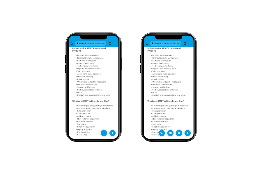 Smartphone : sur le smartphone, les boutons d’action flottants « e-mail » et « téléphone » sont cachés derrière un élément « plus » circulaire. Lorsque l’élément est sélectionné, le menu se déploie. D’un simple clic, vous pouvez maintenant passer à « E-mail », « Téléphone » et « Back-to-top ».