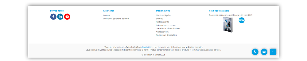 Le pied de page est une section de la page Web. Il se trouve à la fin de la page Web et reste identique sur chaque page. Vous trouverez ici des informations importantes, comme par exemple l’adresse et le numéro de téléphone, nos conditions générales de vente et des informations sur la protection des données.