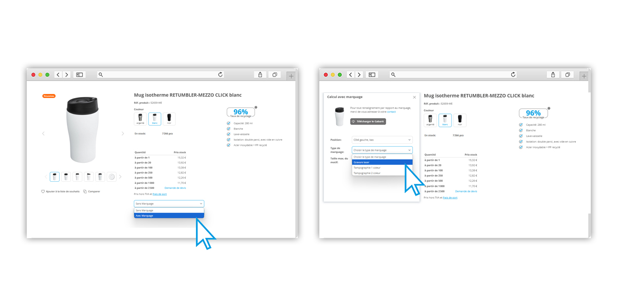 Marquage publicitaire : Vous pouvez choisir directement un marquage pour votre produit, l’ajouter au panier et télécharger le fichier du logo.