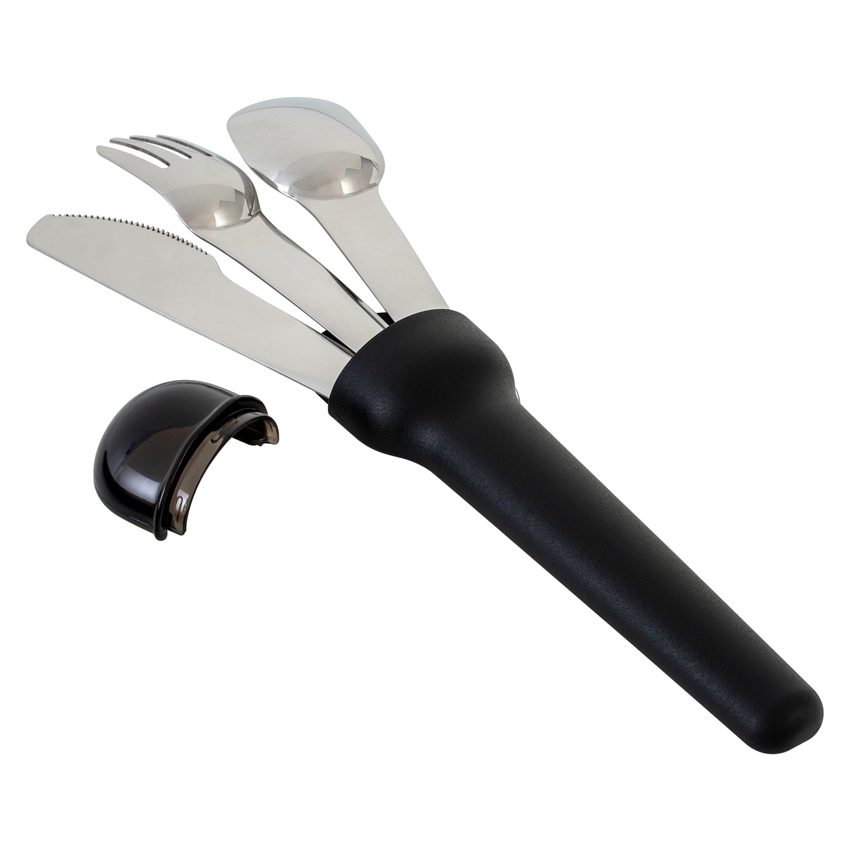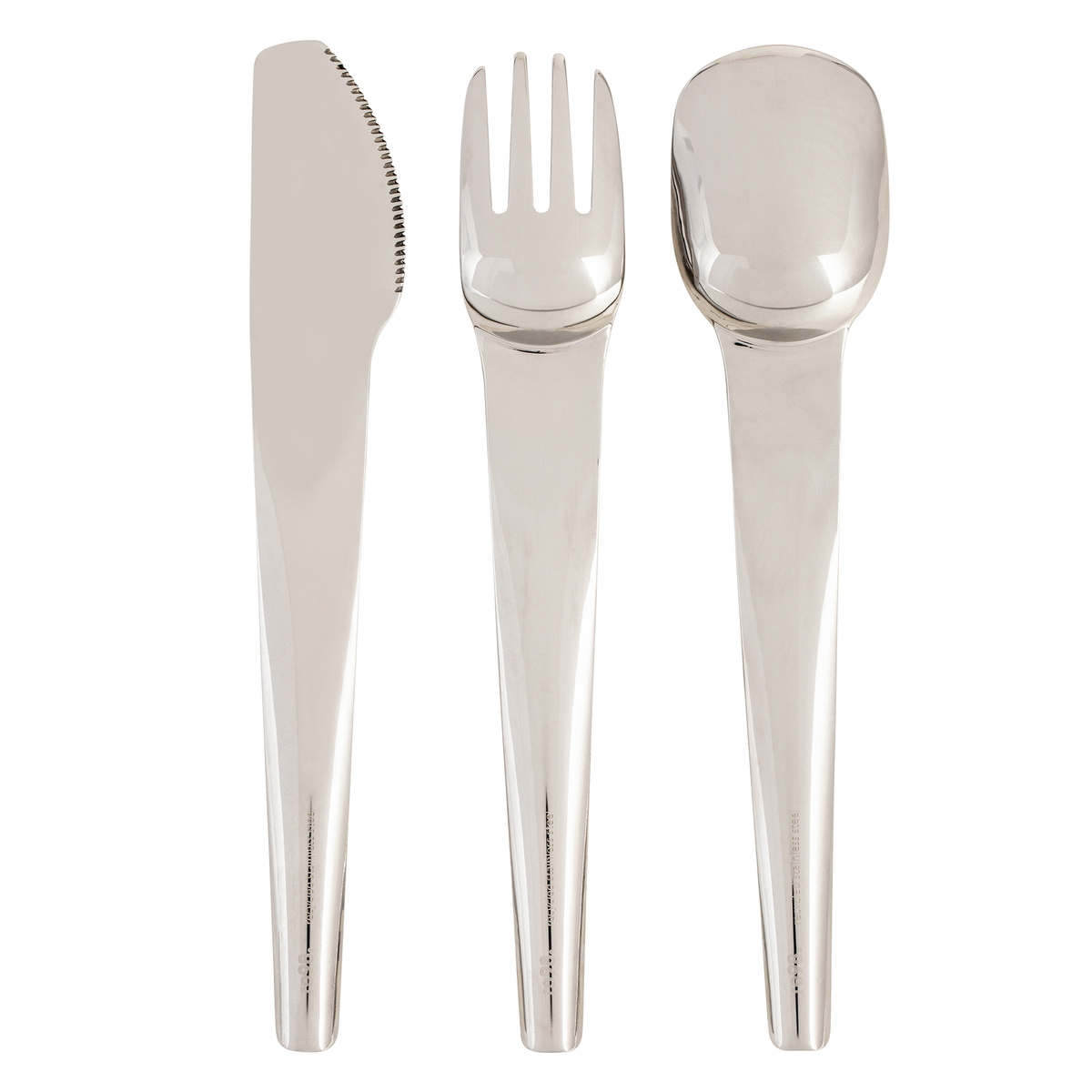 Ingénieusement empilés les uns sur les autres, la cuillère, la fourchette et le couteau sont rangés dans une boîte en plastique qui se ferme de manière sécurisée. La forme de la tête des couverts et une légère courbure dans les manches assurent un ajustement parfait et permettent un empilage intuitif. Les couverts sont fabriqués en acier inoxydable 304, extrêmement robuste et à haute brillance. Que vous coupiez des fruits ou de la viande, vous ne ferez aucun compromis sur l’affûtage de ce couteau. Doté d’un bord dentelé, il est aussi tranchant que les couteaux ménagers conventionnels. La fourchette, avec ses quatre dents, est parfaitement adaptée pour piquer et prendre les aliments. Les trois couverts tiennent confortablement en main et offrent une taille intermédiaire entre les couverts de repas principal et ceux de dessert, ce qui les rend adaptés à toutes sortes de plats.