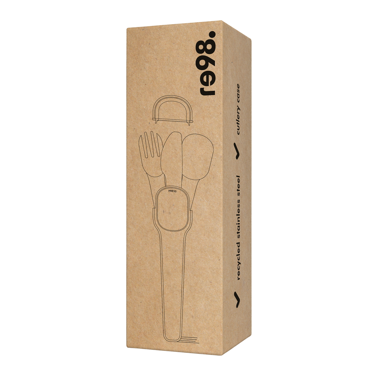 Après utilisation, le set peut être rangé à nouveau dans sa boîte compacte. Celle-ci est fabriquée en polypropylène et polycarbonate, et est disponible en noir, bleu marine, rouge ou blanc. Fermée avec un couvercle transparent en PC, il peut être ouvert et retiré par une légère pression sur le dos plat (indiqué par « Press »). Une fonction supplémentaire permet d'utiliser la boîte comme support à couteaux, protégeant ainsi les têtes des couverts du contact avec les surfaces. Ainsi, vous pouvez utiliser les couverts de manière hygiénique dans n'importe quel environnement. Tous les composants peuvent être lavés au lave-vaisselle.