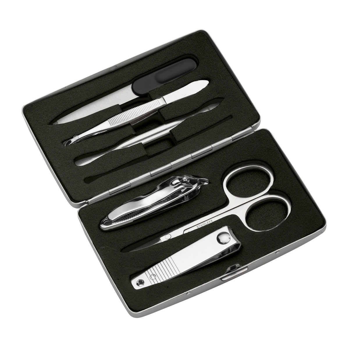 Utile en voyage comme à la maison, ce set de manucure regroupe sept outils pour prendre soin de vos ongles, rangés dans un étui en aluminium. Il comprend une lime à ongles, des ciseaux à ongles, des coupe-ongles, une pince à épiler et un pousse-cuticules. L’étui est personnalisable avec une gravure discrète au laser ou une tampographie monochrome.Questions sur le produit "Set de manucure RE98-PIETRASANTA argenté" ?