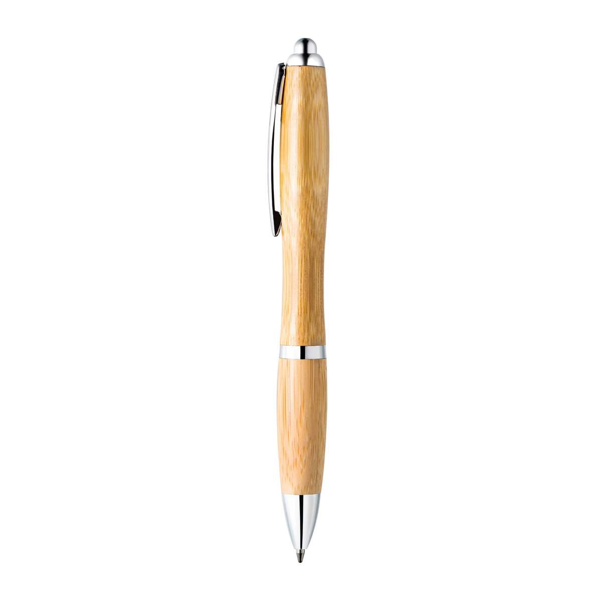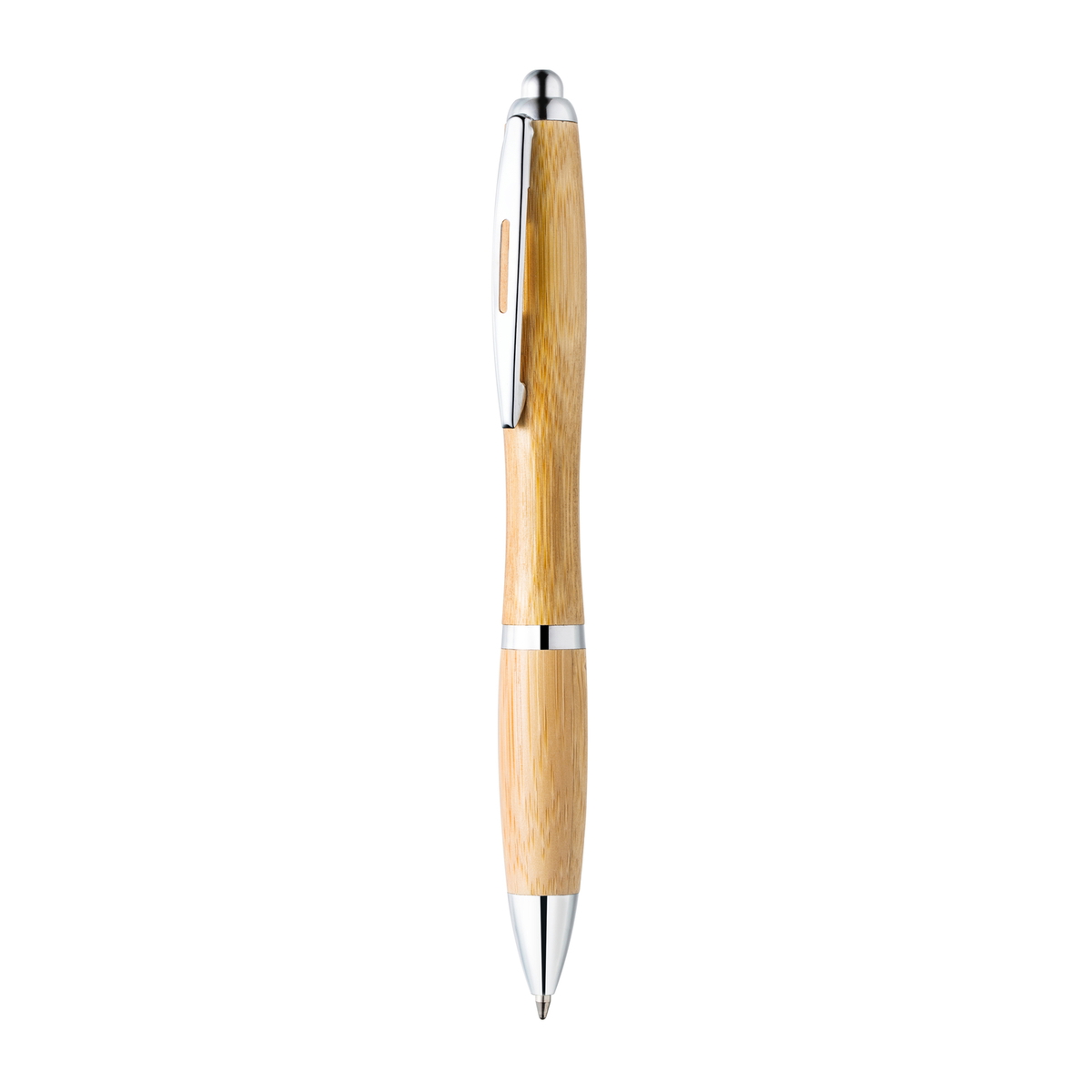 Een chique balpen uit duurzaam bamboe, die zich door zijn bolle vorm van de menigte onderscheidt. Fraaie zilverkleurige sierelementen die het edele ontwerp van deze bamboe-balpen benadrukken.
