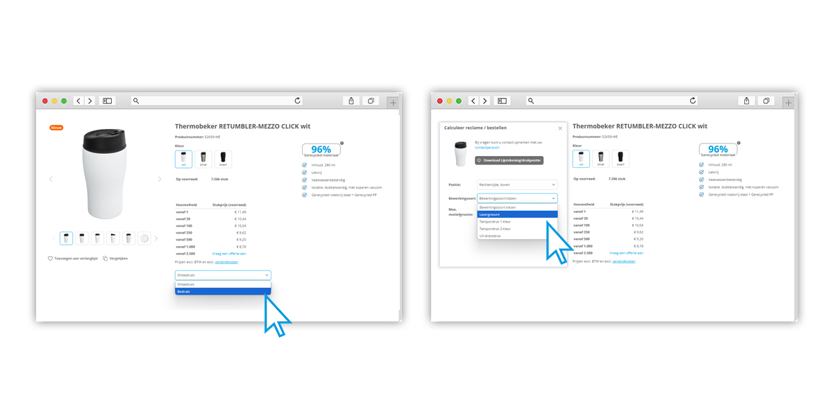 Om toegang te krijgen tot de calculatie, selecteer je op de artikelpagina in het keuzemenu onder de prijzen ‘Bedrukt’. De standaardinstelling is altijd ‘Onbedrukt’. Er wordt een venster geopend. Selecteer nu de positie, het type bewerking en de grootte. De grootte wordt gegeven als de maximale grootte van het logo/motief. Afhankelijk van de gekozen bewerking en grootte wordt er meer informatie weergegeven.