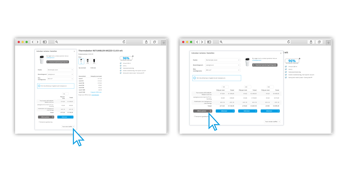 Klik op de button ‘Meer staffels weergeven’ om nog twee staffels aan het venster voor de bewerking toe te voegen. Verander de aantallen in de betreffende vakjes om de kosten te vergelijken. Vervolgens kunt u de offerte downloaden door op ‘Offerte printen’ te klikken.