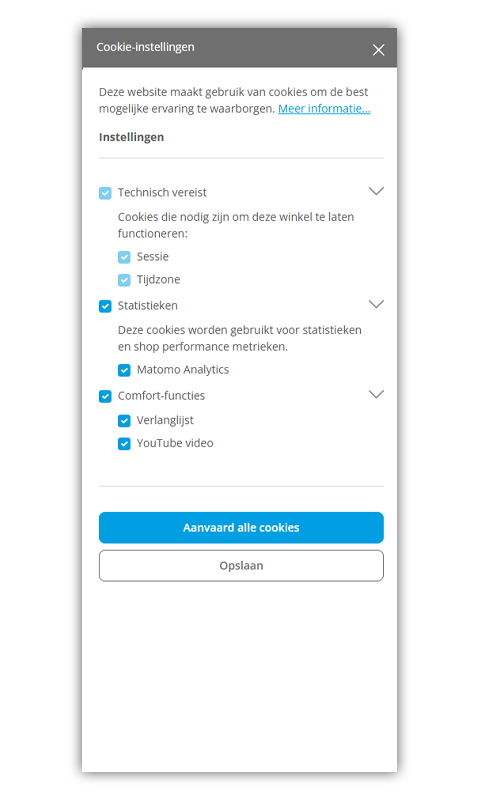 - Technisch noodzakelijke cookies: Technisch noodzakelijke cookies zorgen voor de basisfuncties van een webshop, zoals de functionaliteit van het winkelmandje of het bewaren van uw favoriete artikelen. Bovendien bewaart een cookie ook uw cookie-instellingen, zodat u niet bij elk bezoek aan de website dezelfde vraag krijgt. Tot onze technisch noodzakelijke cookies behoren: Sessie: Wij gebruiken sessiecookies zodat u de basisfuncties van de webshop kunt gebruiken. Deze cookies worden verwijderd nadat u de webshop sluit. CRSF-bescherming: De CRSF-bescherming voorkomt dat hackers in uw naam handelingen in de webshop kunnen verrichten.
