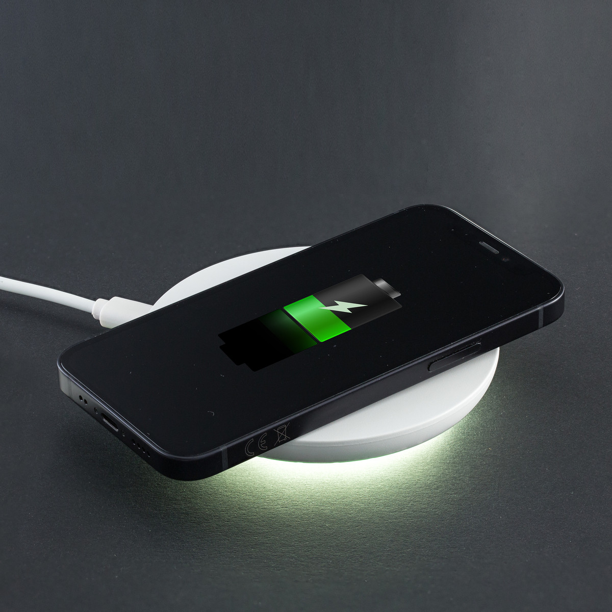 De Wireless Charger heeft een uitgangsvermogen van maximaal 15 watt (Fast Charge), afhankelijk van de compatibiliteit van het op te laden apparaat. Wanneer het apparaat op een stroombron is aangesloten, gaat een witte lichtring aan de onderkant van de Charger branden. De Charger is zo ontworpen dat het licht de indruk geeft dat het apparaat zweeft. Tijdens het opladen pulseert de lichtring wit licht.De witte Charger kan worden afgewerkt met een opvallende UV-druk over het gehele oppervlak of een 1- tot 4-kleurige tampondruk.