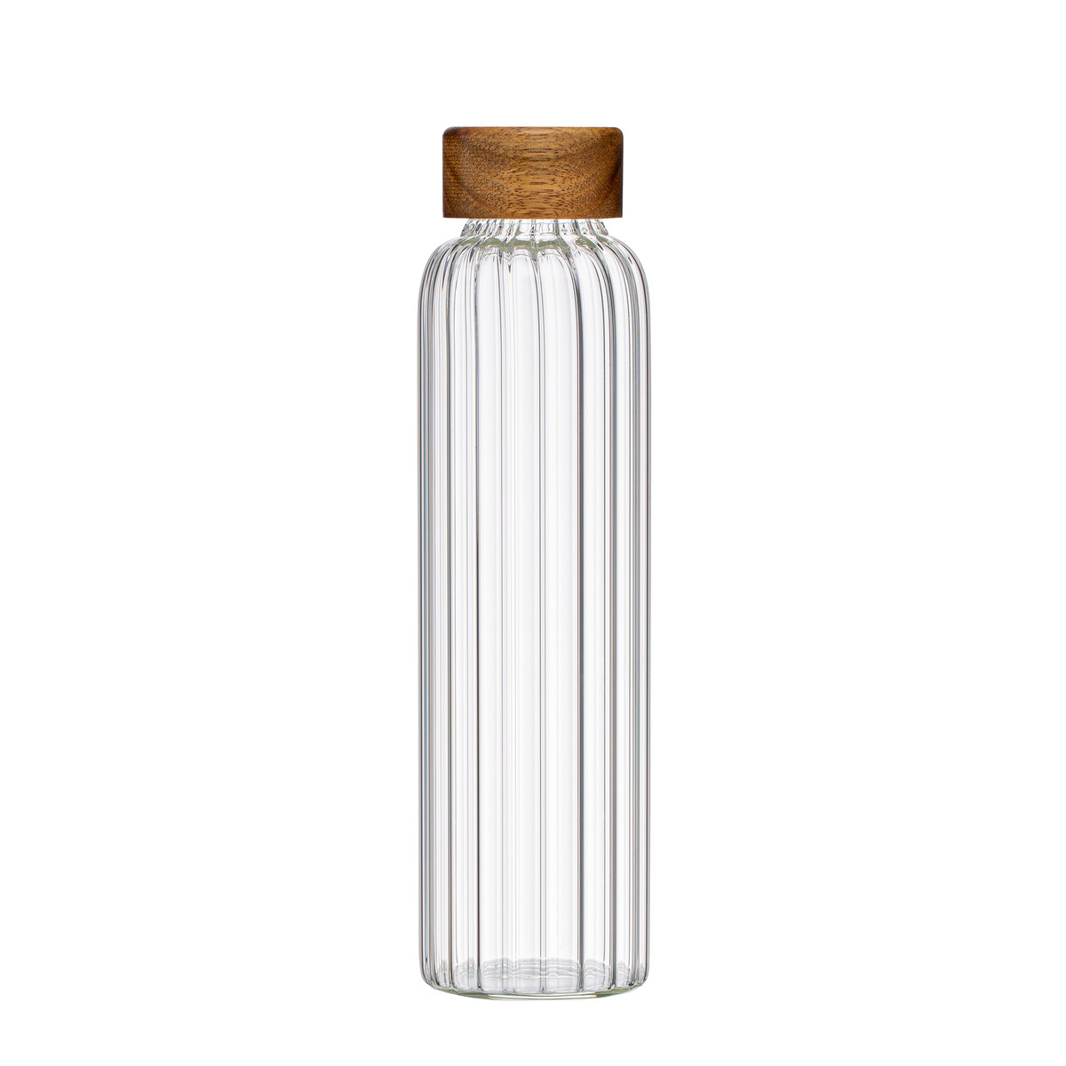 Deze drinkfles combineert praktisch nut met een aantrekkelijk design. De lekvrije fles van 500 ml is veelzijdig in gebruik, zowel thuis, op kantoor als onderweg. Het hoogwaardige borosilicaatglas is extreem duurzaam en hittebestendig. Daardoor is de fles ook geschikt voor warme dranken. De ribbels aan de binnenkant geven het item een nieuwe visuele dimensie en maken afwerking op de glazen fles mogelijk. De acaciahouten deksel zorgt voor een natuurlijke uitstraling en een aangenaam gevoel. Tip: De glazen fles kan veilig worden gereinigd in de vaatwasser (zonder deksel).Zowel het deksel als het glazen lichaam kunnen worden aangepast. CO2-lasergravure en pad-printing zijn hiervoor beschikbaar.