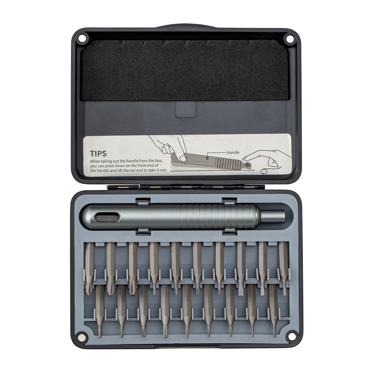 Precieze taken vragen om precies gereedschap. Deze hoogwaardige set mechanisch precisiegereedschap in een stijlvolle zwart box is speciaal ontworpen voor ingewikkelde taken aan laptops, computers, brillen en dergelijke. De matte schroevendraaier met bithouder, samen met de 19 magnetische bits gemaakt van ultrahard S2 roestvrij staal - inclusief 9 sterschroefbits, 2 platkopschroefbits en 8 kruiskopschroefbits - zorgen voor maximaal aanpassingsvermogen en precisie. De box, gemaakt van gerecycled ABS-kunststof, straalt niet alleen elegantie uit, maar bergt de inhoud ook veilig op dankzij de hoogwaardige magnetische sluiting. De binnenkant, gemaakt van gerecycled polypropyleen, beschermt en organiseert het gereedschap optimaal.De doos kann worden bewerkt met UV- of tampondruk. Op verzoek bieden we ook lasergravure aan op de roestvrijstalen bithouder.