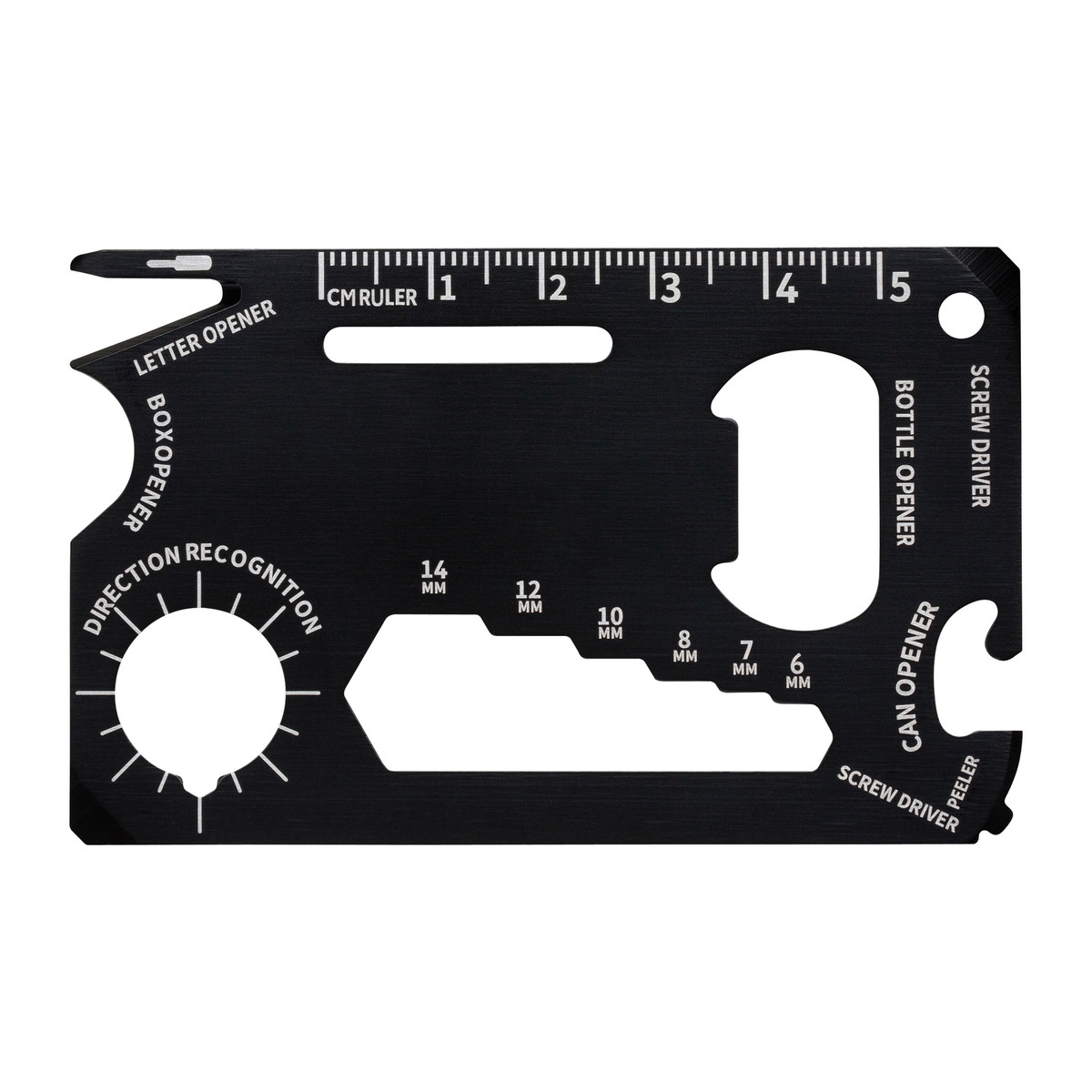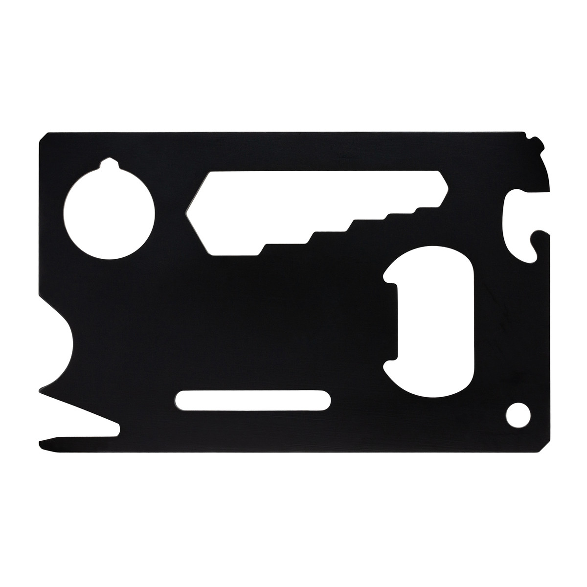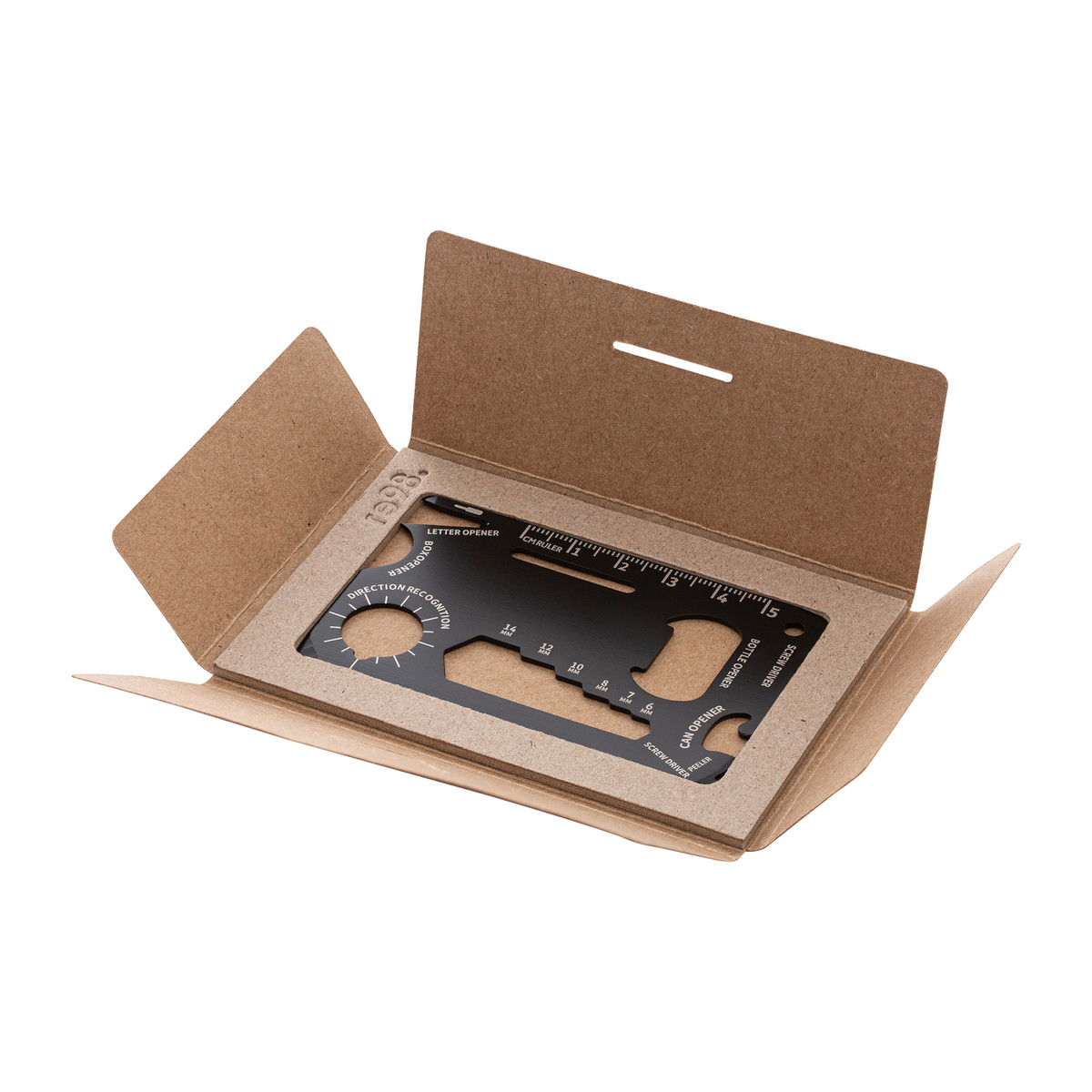 Deze handige kaarttool ter grootte van een creditcard valt op door zijn veelzijdige functies en compacte vorm. Dankzij zijn vorm past hij eenvoudig in portemonnee, broekzakken of rugzakken. Zo wordt de tool een ideale metgezel voor reizen en buitenavonturen. De multitool is gemaakt van hoogwaardig roestvrij staal met een zwarte coating. Het biedt 8 functionaliteiten: flesopener, blikopener, liniaal, schroevendraaier, inbussleutel, gradenboog, verpakkingopener en vleugelmoeraandrijver. Met deze veelzijdige kaart bent u goed voorbereid op alledaagse situaties.Branding is mogelijk via lasergravure of UV-druk op de kaarttool. Het artikel wordt geleverd in een hoogwaardige kartonnen doos.