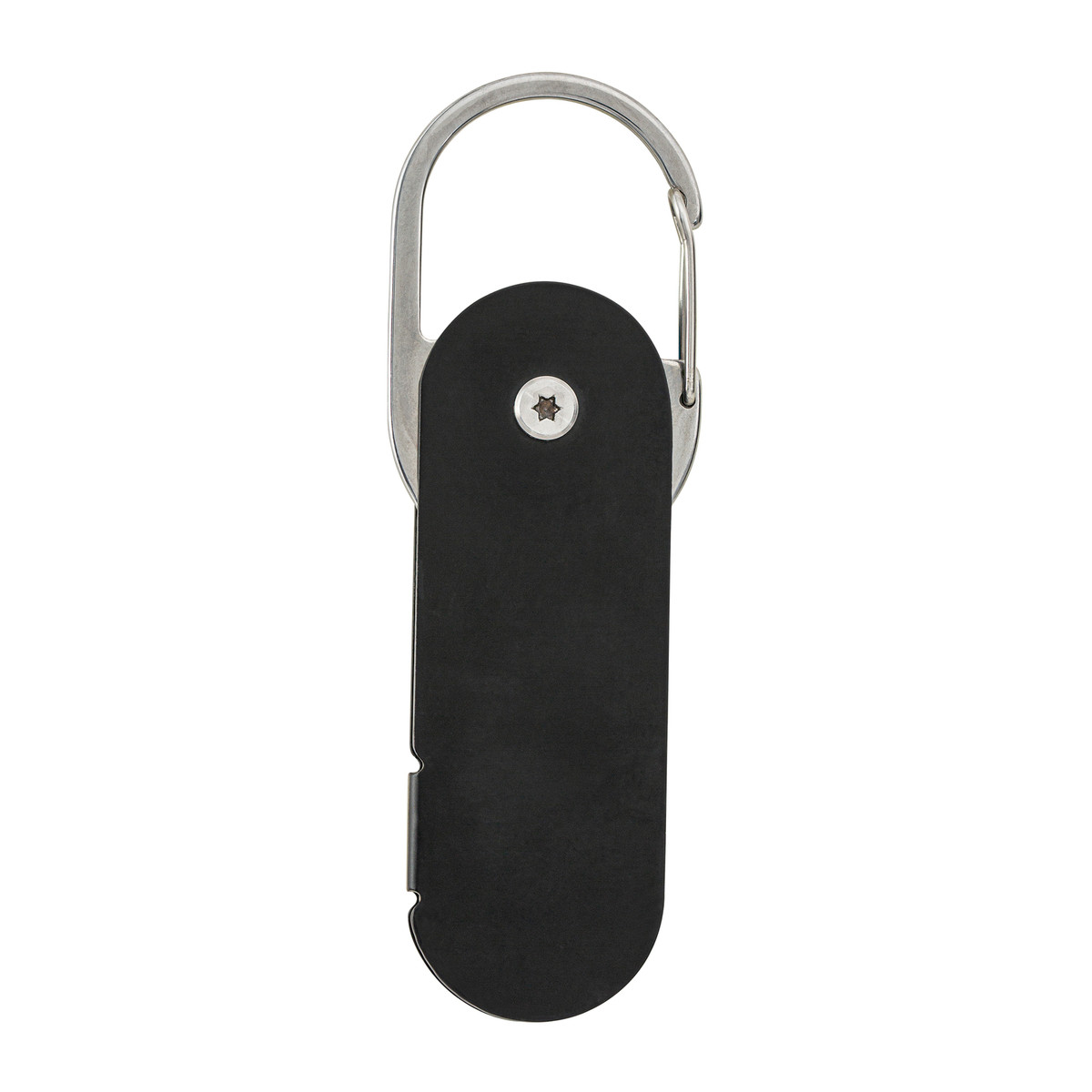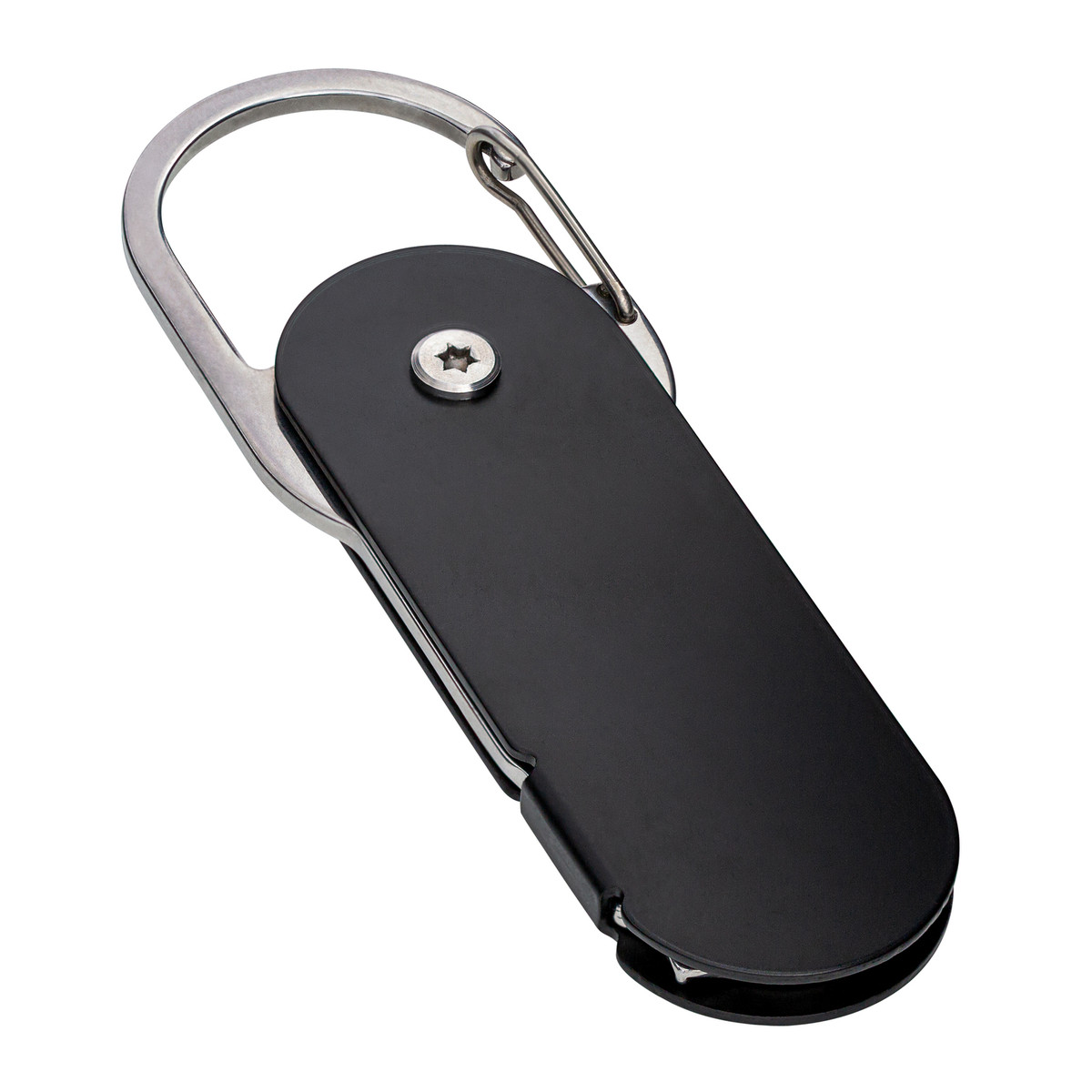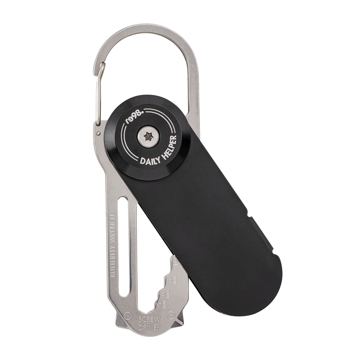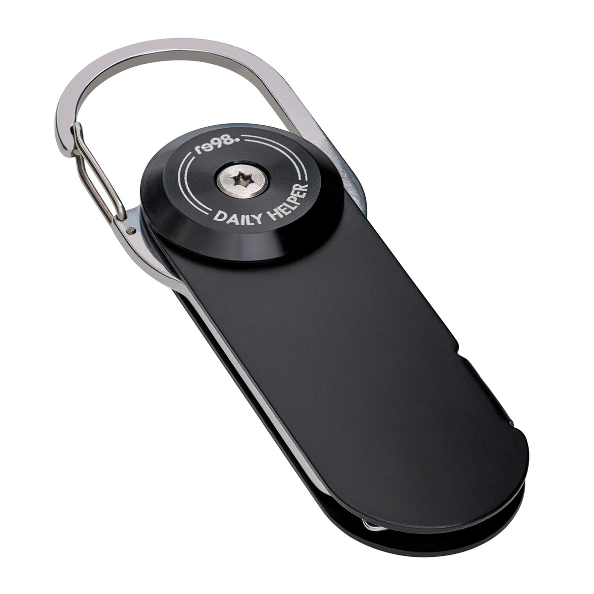 Een gereedschapskist is zwaar en in het dagelijks leven heb je meestal maar een klein deel van het gereedschap nodig. Een alternatief is deze kleine multifunctionele gereedschapset – de hoogwaardige RE98 Daily Helper Tool combineert meerdere praktische functies.Door aan de clip-karabijnhaak te draaien, wordt het gereedschap uitgeklapt. Dankzij de hoogwaardige, interne kogellager blijft het uitgeklapte gereedschap stabiel in een hoek van 180°. Deze set bevat een kruiskopschroevendraaier, een platte schroevendraaier, een moersleutel voor de maten 5, 6, 8, 10, 12 en 14 en een vleugelschroevendraaier. Na gebruik kunt u het gereedschap door draaien weer veilig opbergen in de matzwarte gereedschapsbeschermer. Dan is deze eenvoudig te gebruiken clip-karabijnhaak klaar voor bevestiging aan tassen, riemlussen of een sleutelbos.