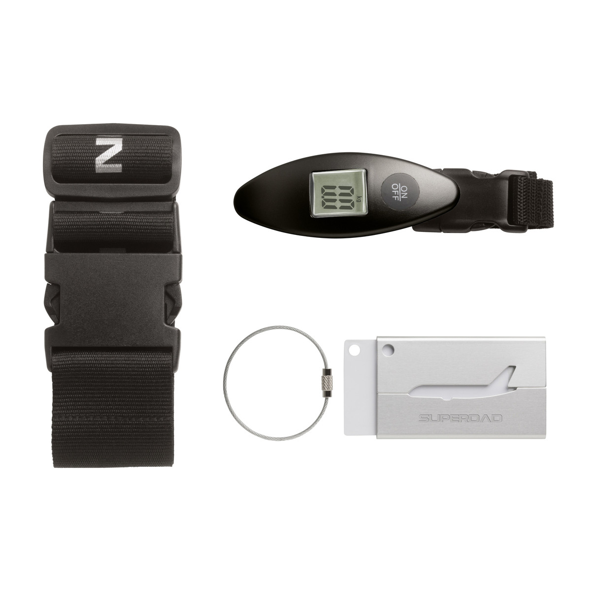 Hoogwaardige cadeauset voor reizigers, bestaande uit een kofferweegschaal, kofferriem en kofferlabel. De kofferweegschaal weegt tot 40 kg/88 lb.