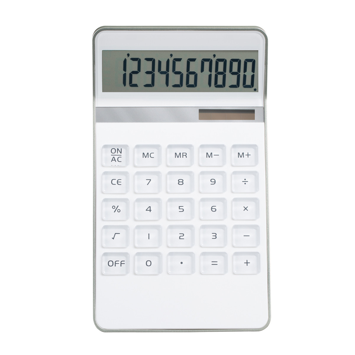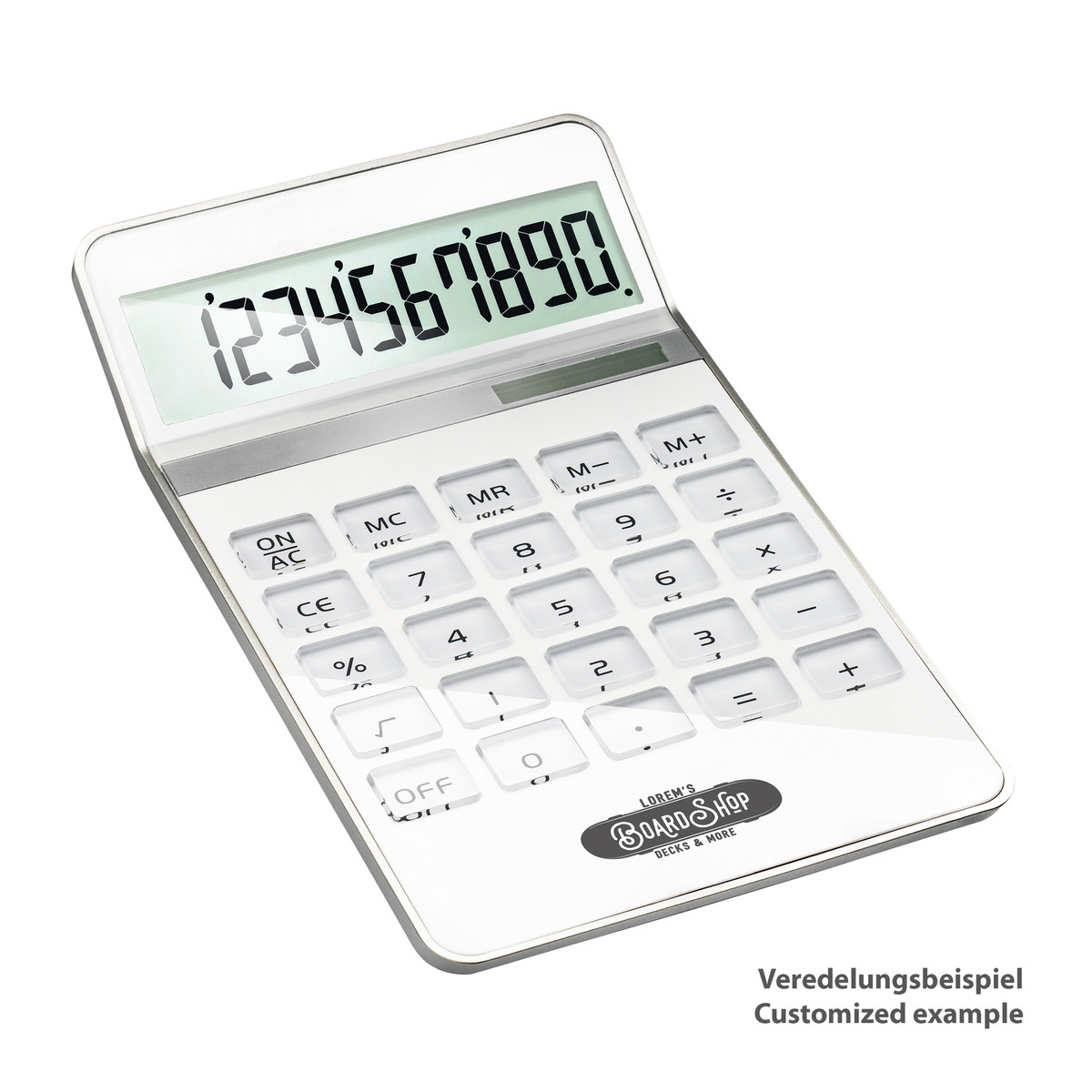 Deze elegante rekenmachine in lak-look is de eyecatcher op elk bureau. De 10-cijferige dual power calculator werkt op zonne-energie. Alternatief bevindt zich op de achterkant ook een batterijvak zodat de batterijen eenvoudig kunnen worden vervangen. Met zijn naar boven gerichte display en de transparante toetsen is deze bureaurekenmachine optisch een zeer hoogwaardig geschenk.