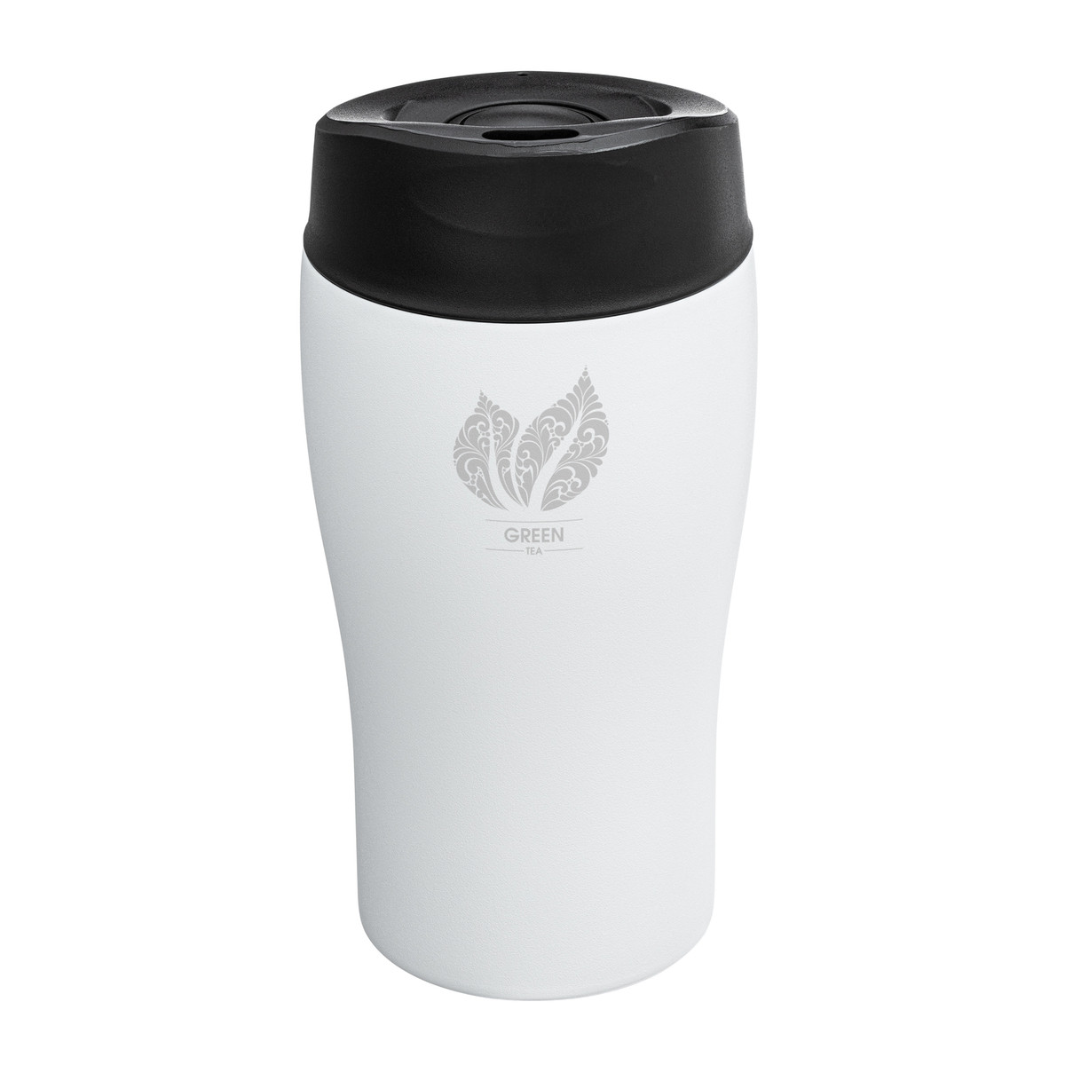 Moeiteloos marketing met RETUMBLER-Mezzo Click - Een voorbeeldlogo in lasergravure op deze thermobeker. Dit stelt u in staat om uw klanten het effect van een gravure tastbaar te laten zien.Dit REFLECTS®-eigen design kenmerkt zich door eenvoudige bediening met één hand: De drinkopening kan worden geopend of gesloten door op de knop van de deksel te drukken. Dankzij de dubbelwandige kopervacuümisolatie houdt de beker dranken tot 4 uur warm of tot 24 uur koud. De lekvrije deksel, gemaakt van polypropyleen, kan worden gedemonteerd en is daardoor gemakkelijk te reinigen.