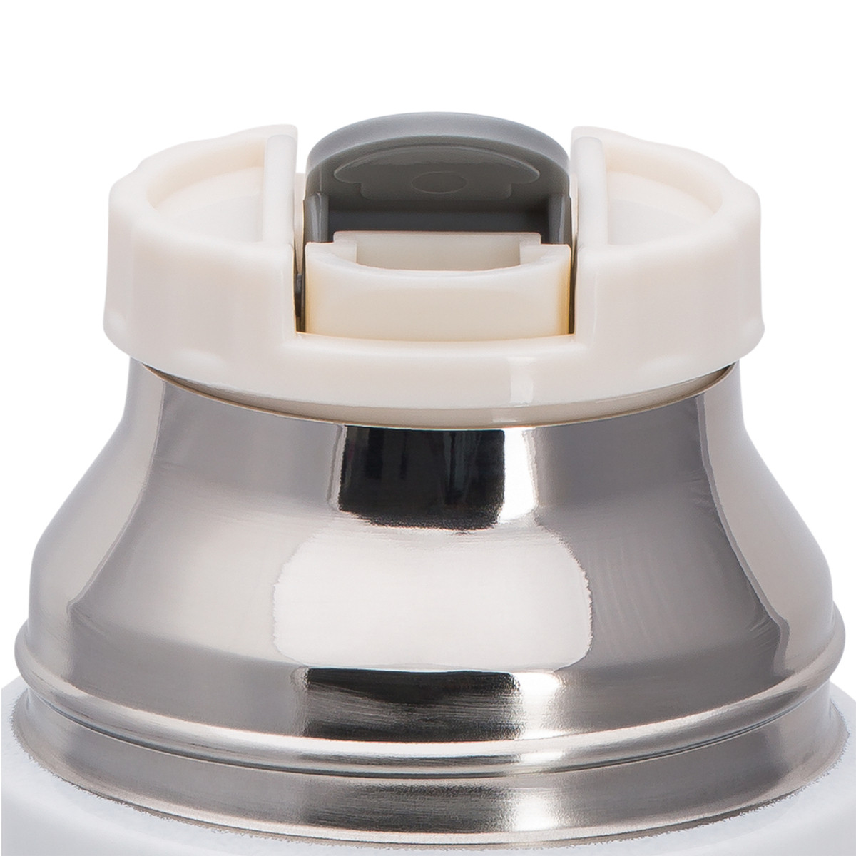 De trendy thermosfles met opgeschroefde kunststof drinkbeker en siliconen handvat heeft een praktische drukknop om de kan te openen en te sluiten. Dubbele wand en met vaccum. Inhoud: 350 ml