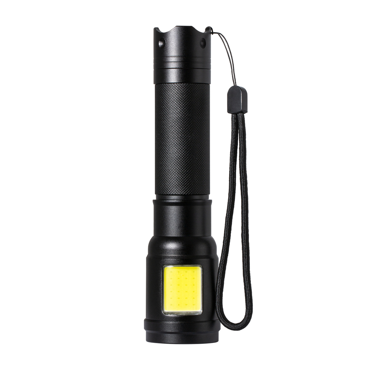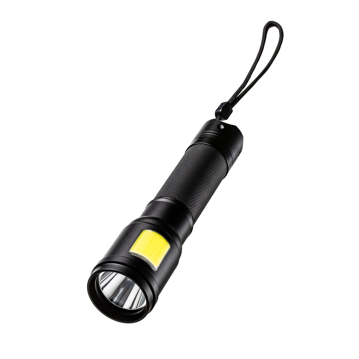 Met deze zaklamp tast u niet in het duister! Hij beschikt over verschillend gepositioneerde lichtbronnen die de oriëntatie in het donker vergemakkelijken. Hij beschikt over een ledlamp aan de voorkant met een vermogen van 150 lumen en een COB-lichtbron aan de onderkant die met 250 lumen de bodem direct voor de lamp optimaal belicht. Beide lichtbronnen kunnen afzonderlijk worden ingeschakeld. De zaklamp beschikt over een draaglus en een stabiele metalen behuizing die ideaal geschikt is voor lasergraveringen.